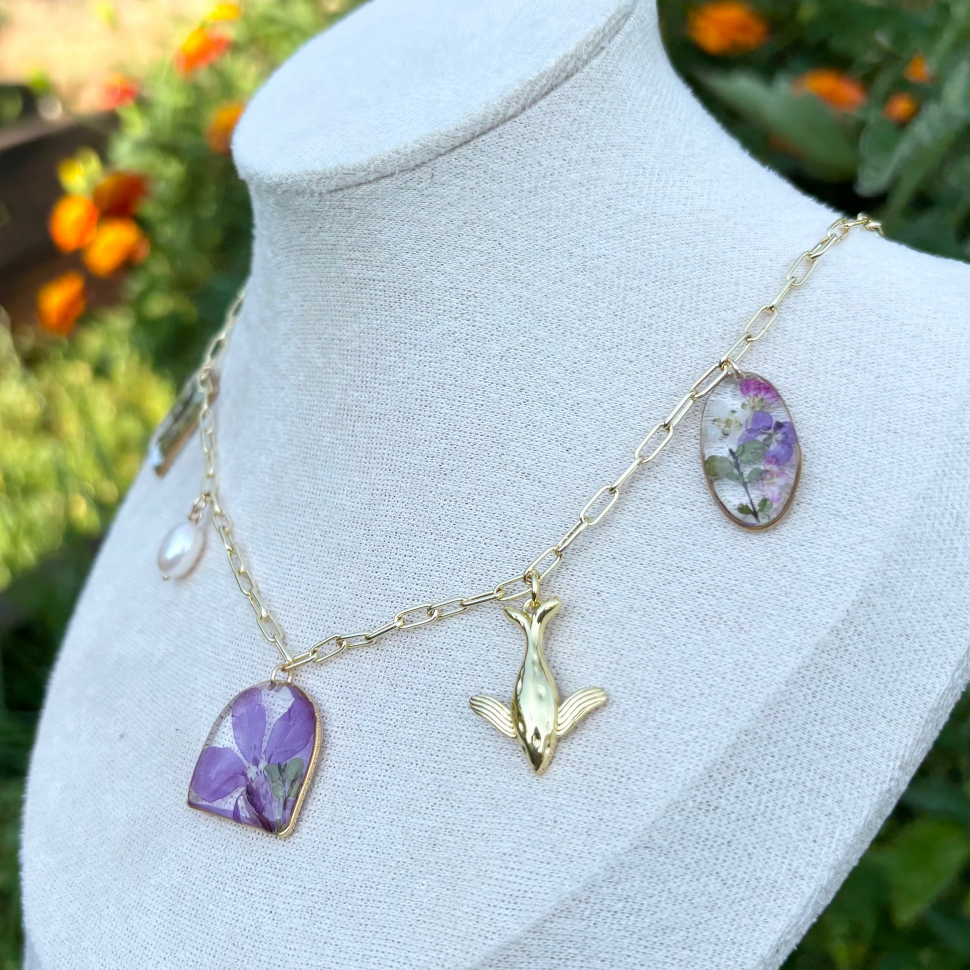 Made with real flowers such as purple Lobelia flower, purple, white, and pink Alyssum flowers, tiny green leaf from my garden, pearl, and gold filled charm (whale).