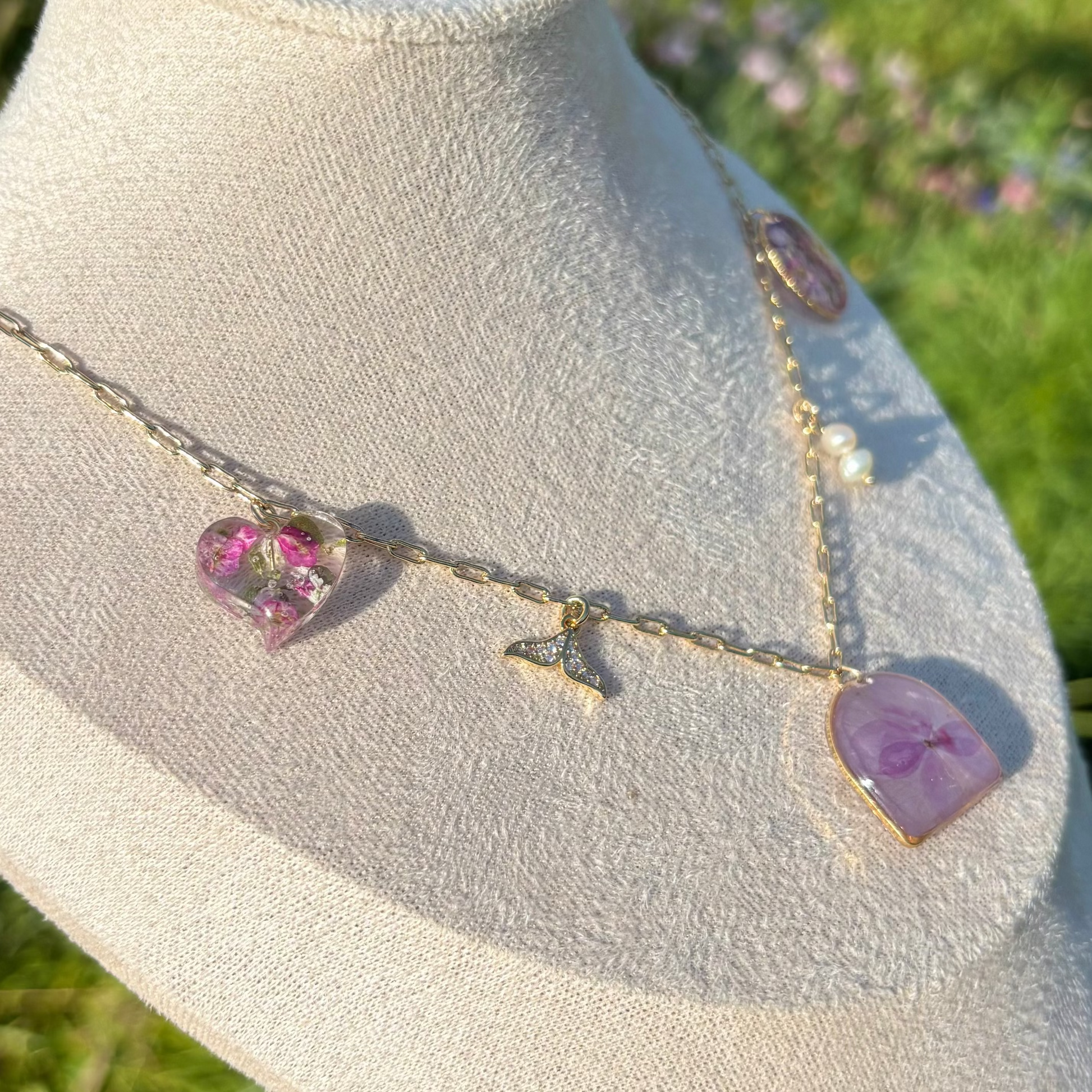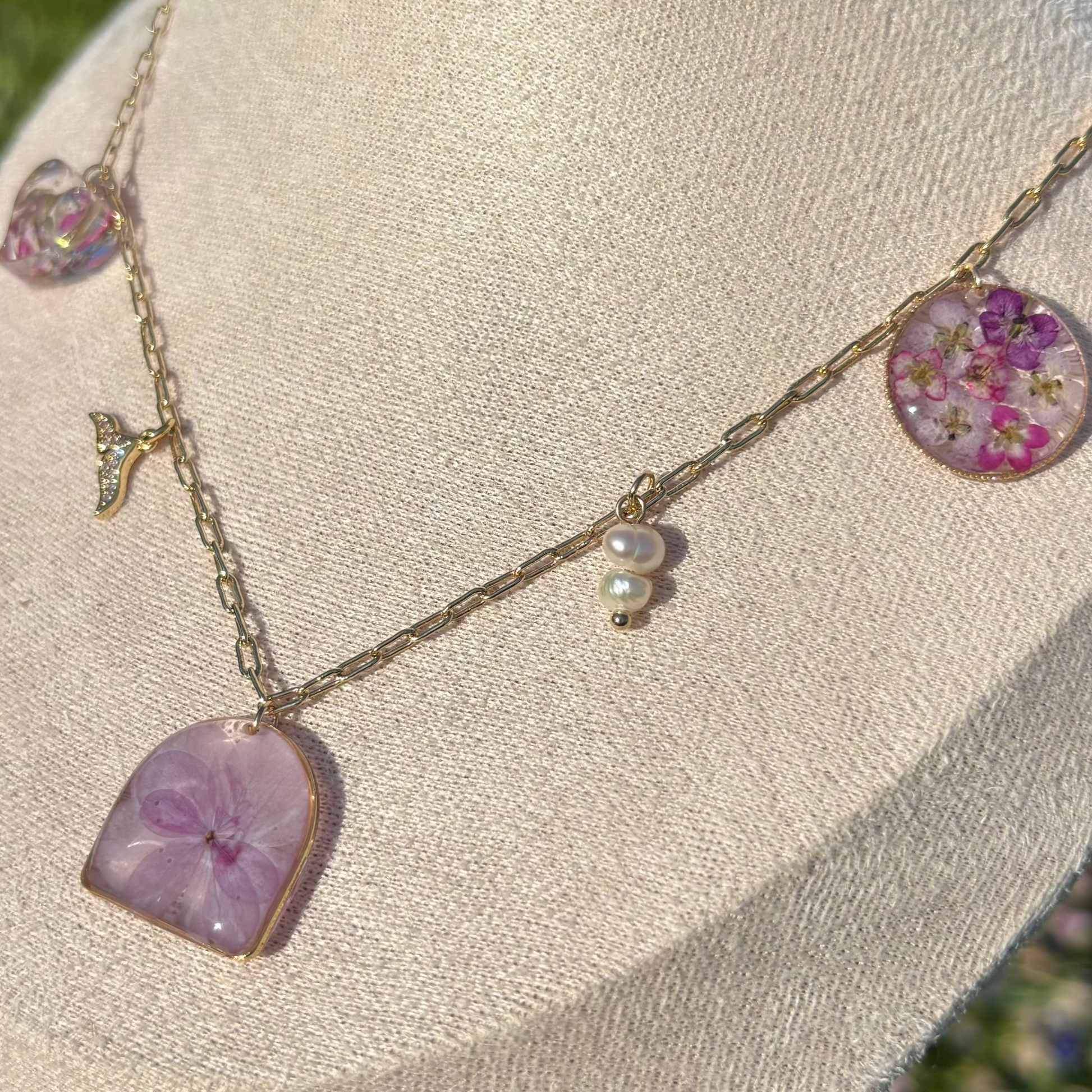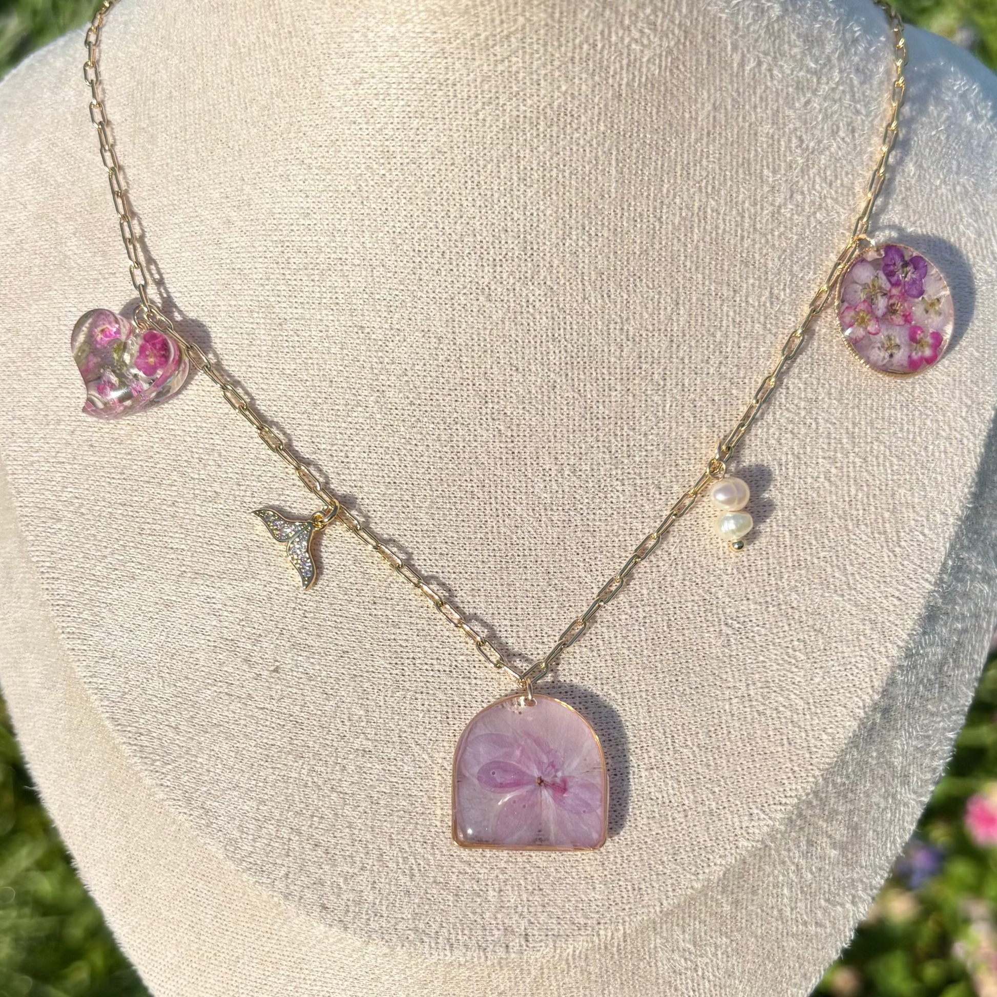 Made with real flowers such as purple and pink Alyssum flowers, pink hydrangea flower, pearl, and gold filled charm (mermaid tail).