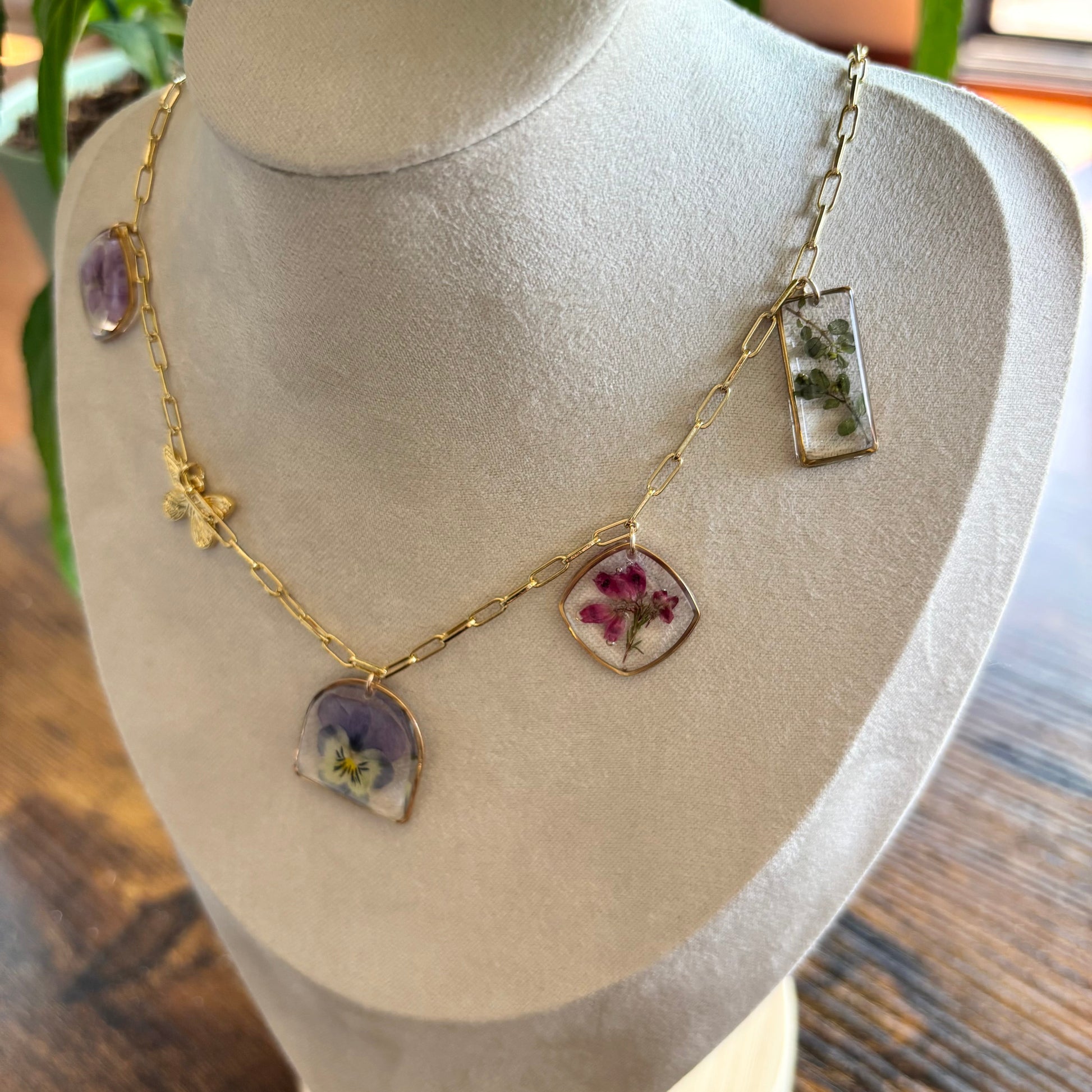 Made with real tiny green leaves, Erica flowers, Viola flower, and Gold filled butterfly charm.