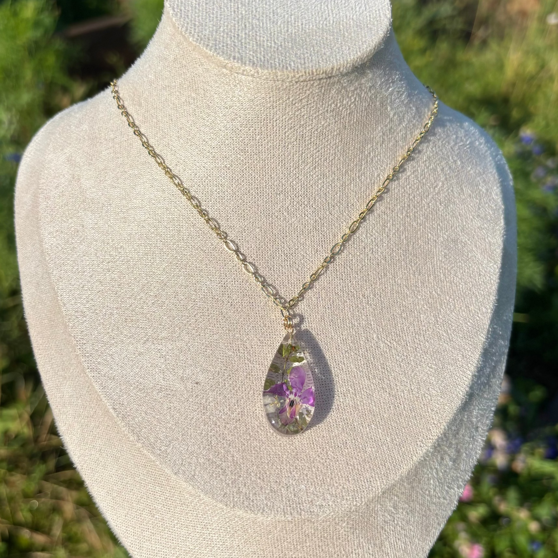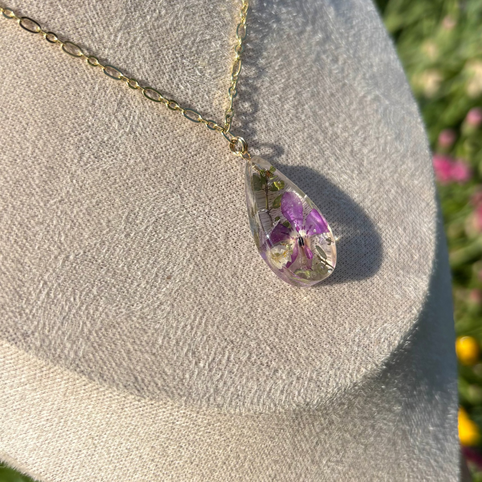 Care instructions: I use pressed or dried flowers to keep the beautiful colors of the flowers. However, the color may change or fade over time due to natural processes. Storing it away from direct sunlight when not in use will keep its color even longer. Please avoid direct contact with chemicals such as sunscreen and perfumes for the gold materials.